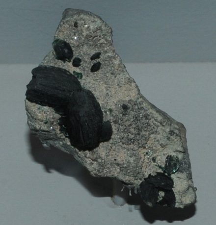This sample of libethenite is displayed in the Smithsonian Museum of Natural History. Libethenite is a phosphate mineral of copper with the composition Cu2(PO4)(OH). The sample at left is about 6 cm across and is from Rokana mine, Zambia.