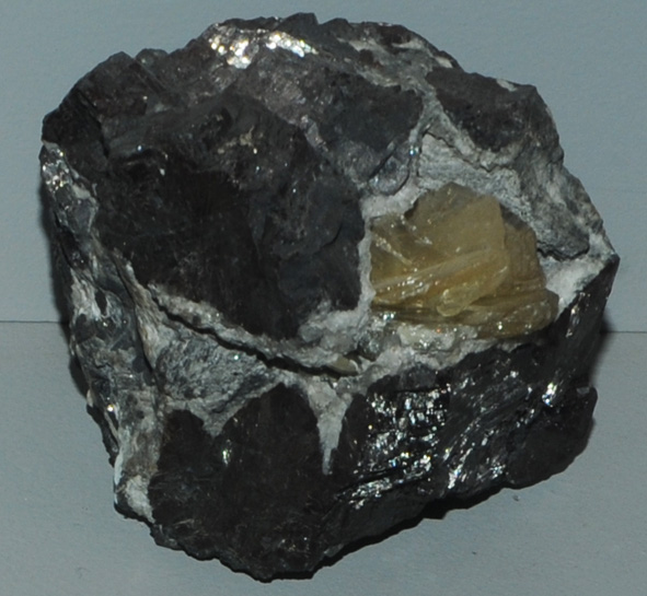 This sample of matlockite is displayed in the Smithsonian Museum of Natural History. Matlockite is a compound of lead with chlorine and fluorine. It has the composition PbClF. The sample at left is about 8 cm across and is from Matlock, Derby, England. It is described as matlockite with galena. Matlockite is usually colorless to light yellow.