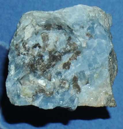 This sample of merwinite is displayed in the Smithsonian Museum of Natural History. Merwinite is a silicate mineral with the composition Ca3Mg(SiO4)2. The sample at left is about 8 cm and is part of the collection of Cretaceous Period minerals from Crestmore, California. It is described as merwinite with blue calcite.