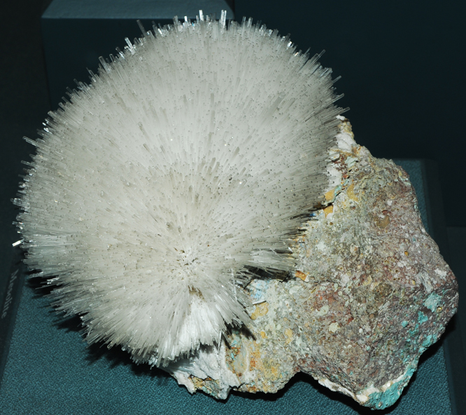 This sample of mesolite is displayed in the Smithsonian Museum of Natural History. Mesolite is a silicate mineral of composition Na2Ca2Si9Al6O30.8H2O. The sample at left is about 15 cm across.