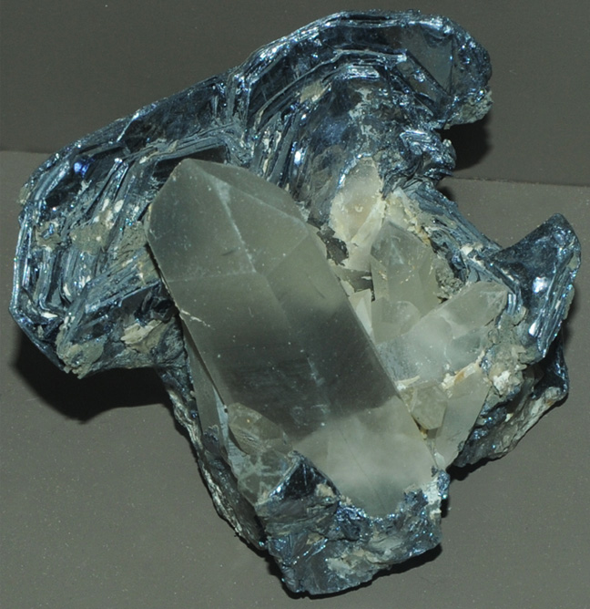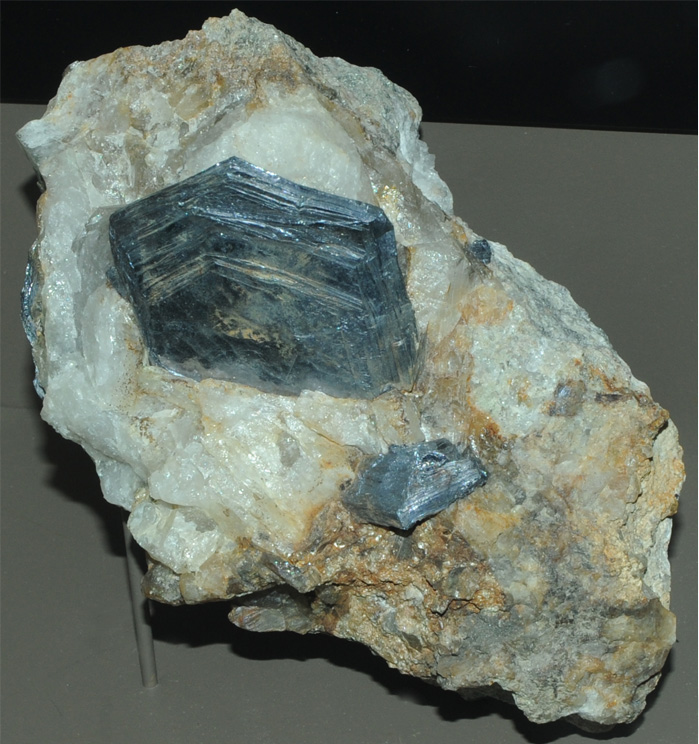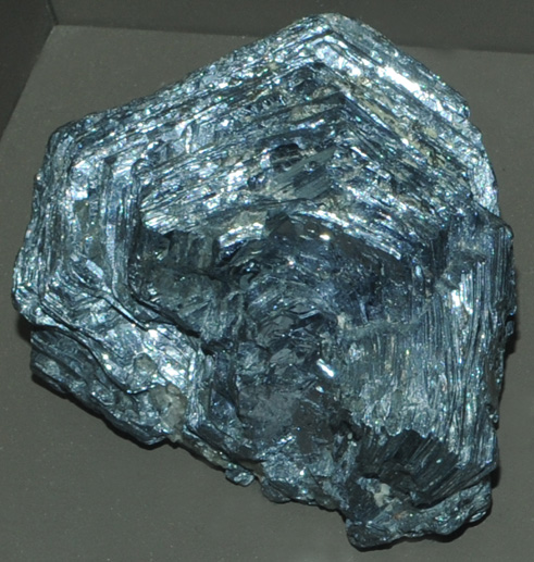 This sample of molybdenite is displayed in the Smithsonian Museum of Natural History. Molybdenite is a sulfide mineral of molybdenum with the composition MoS2. The sample at left is about 10 cm across and is from Chelan, Washington.