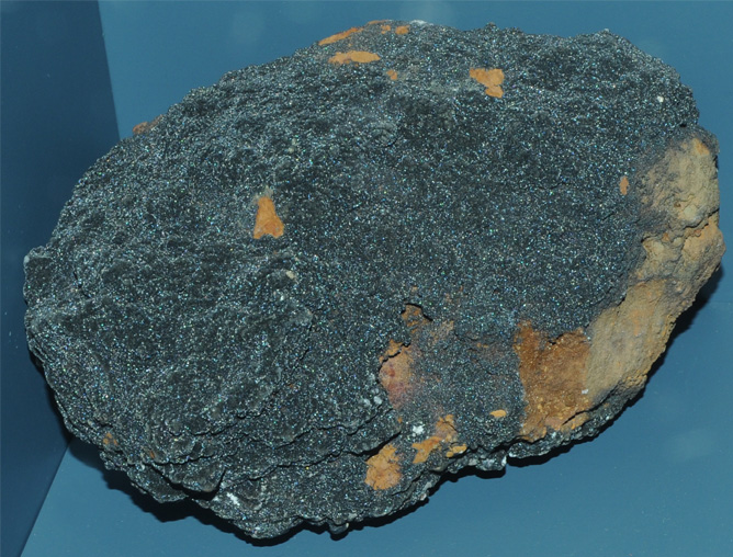 This sample of mottramite is displayed in the Smithsonian Museum of Natural History. Mottramite is a oxide mineral of copper, lead, zinc, and vanadium with the composition Pb(Cu,Zn)VO4(OH). The sample at left is about 25 cm across and is from Shattuck shaft, Bisbee, Arizona.