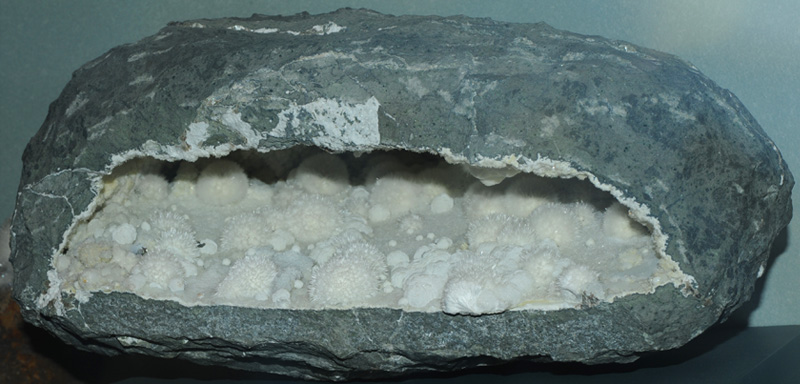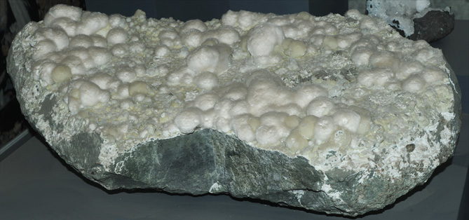 These samples of okenite are displayed in the Smithsonian Museum of Natural History. Okenite is a silicate mineral of calcium with the composition Ca10Si18O46.18H2O. The sample above is about 25 cm across and is from Bombay, Maharashtra, India.