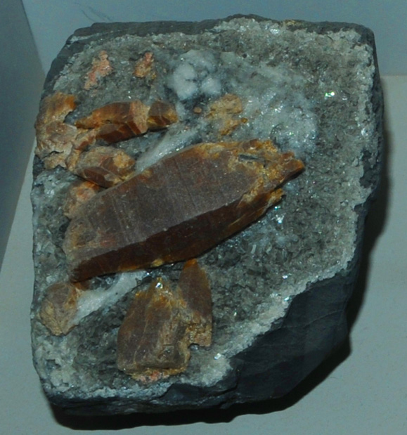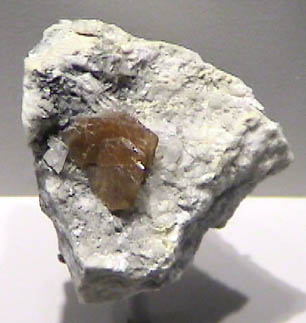 Parisite is a mineral which contains lanthanum and cerium as well as calcium and flourine. It has the general composition Ca(Ce,La)2Ca(CO3)3F2. The origin of this sample is Muzo, Colombia. The sample measures about 7 cm across. The sample is on display in the Smithsonian Museum of Natural History.