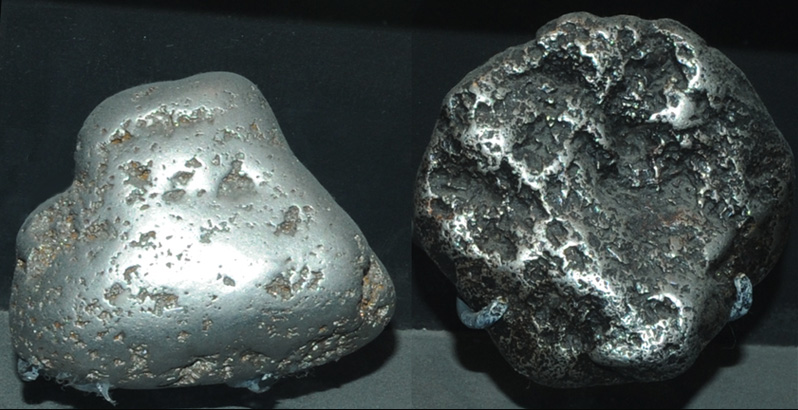 Platinum![]() PtThese samples of platinum are displayed in the Smithsonian Museum of Natural History. These rare platinum nuggets are about 5 cm across. The left one at 444.4 grams is from Nizhniy Tagil, Urals, Russia. The right one is 536.7 grams and is from Choco, Colombia. Mindat: Platinum
