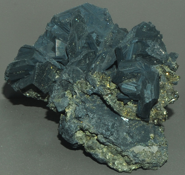 This sample of polybasite is displayed in the Smithsonian Museum of Natural History. Polybasite is a sulfide mineral of silver, copper and antimony. It has the composition (Ag,Cu)16Sb2S11. The sample at left is about 15 cm across and is from Las Chispas mine, Arizpe, Sonora, Mexico.