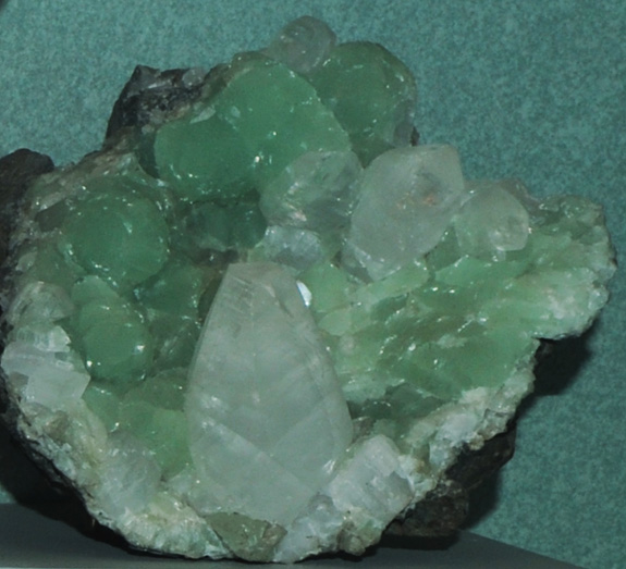 This is about one quarter of aprehnite sample that is about 40 cm across and is from Fairfax quarry, Centreville, Virginia. It is described as prehnite with fluorapophyllite.
