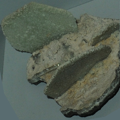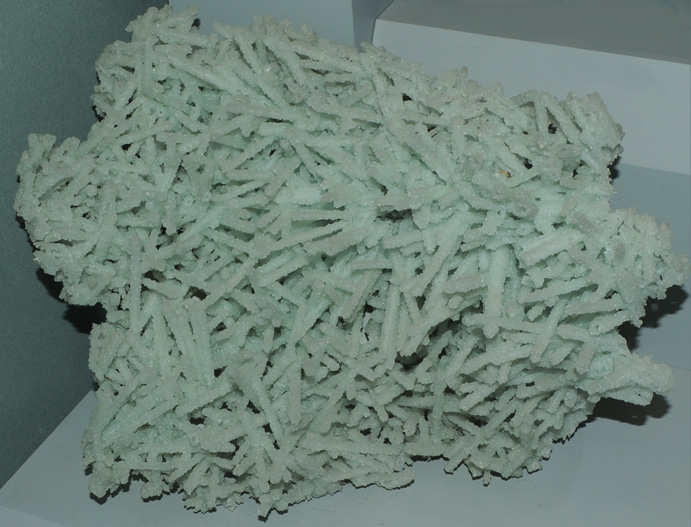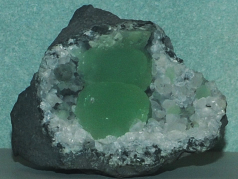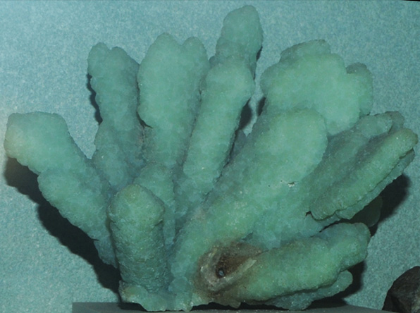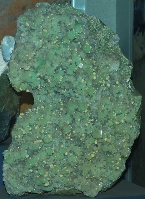 This sample of prehnite is displayed in the Smithsonian Museum of Natural History. Prehnite is a silicate mineral with the composition Ca2Al(Si,Al)4O10(OH)2. The sample at left is about 8 cm across and is from Calvinia, Cape Province, South Africa.