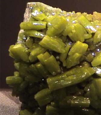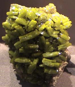 Pyromorphite is a phosphate of lead with the composition Pb5(PO4)3Cl. This sample is about 6x10 cm and is from Bunker Hill mine, Kellog, Idaho. This sample is on display at the Smithsonian Museum of Natural History. "This exceptional specimen was recovered from a famous lead mining district. Pyromorphite also displays shades of brown, red and yellow."