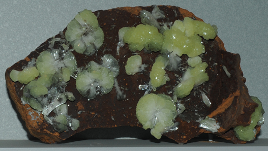 This adamite sample is from Ojuela mine, Mapimi, Durango, Mexico. It is about 4 x 10 cm.