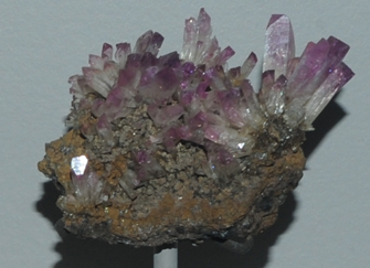 These samples of adamite are displayed in the Smithsonian Museum of Natural History. Adamite contains zinc and arsenic with the composition Zn2AsO4(OH). This sample is about 6x6 cm and is from Tsumeb, Namibia. It is classified as cuprian adamite because of the copper content.