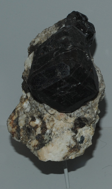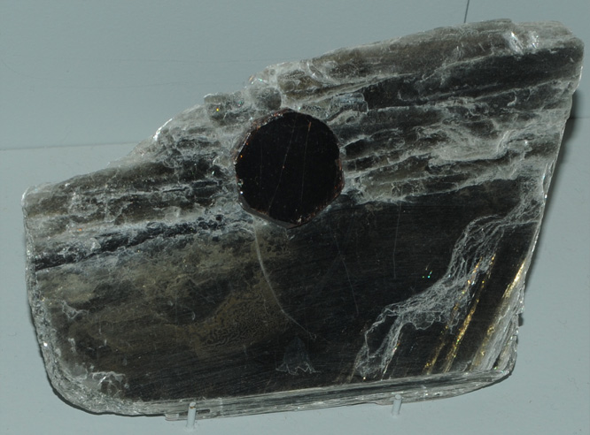 | This is a sample of muscovite with an embedded almandine garnet. The sample is about 7 x 10 cm. It is from Deer Park mine, Penland, North Carolina. |