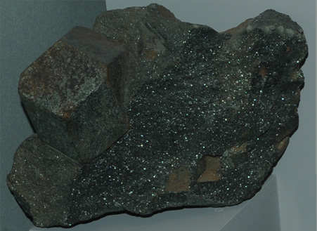 This is a sample of almandine-bearing schist from Fort Wrengell, Alaska. It is about 25 x 30 cm. |  |