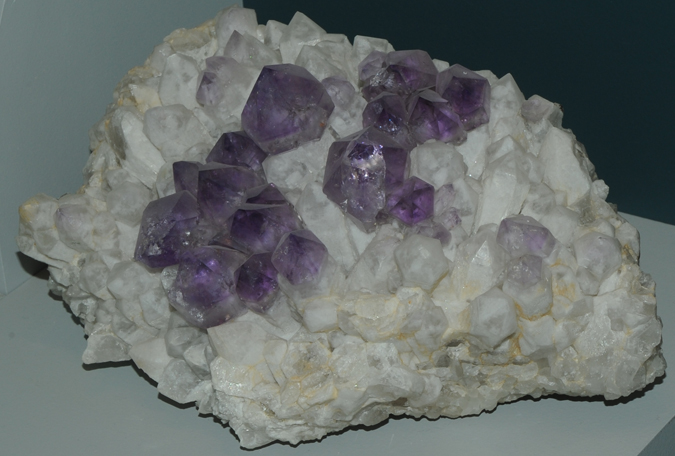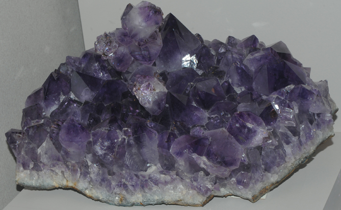 These samples of amethyst are displayed in the Smithsonian Museum of Natural History. Amethyst is a variety of quartz with the characteristic composition SiO2, but distinctive and popular for its dramatic purple color. The sample at left is from Upper Providence, Pennsylvania and is about 10x8 cm. The gem is 36.2 carats.