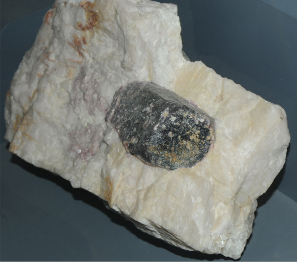 This sample is described as andalusite altering to muscovite. This sample is about 7x5 cm and is from Harding pegmatite, Dixon, New Mexico.