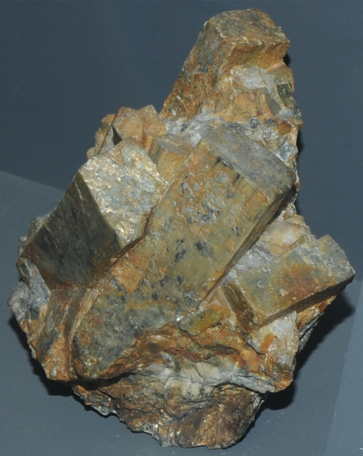 Andalusite is a silicate with composition Al2SiO5 . This sample is about 7x7 cm and is from Lusens Alp, Sellraintal, Austria. The chemical compostion is the same as the minerals sillimanite and kyanite. These samples are on display at the Smithsonian Museum of Natural History.