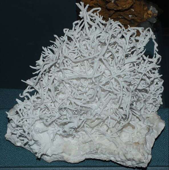 This sample of Aragonite is displayed in the Smithsonian Museum of Natural History. Aragonite is a carbonate mineral which contains calcium with the composition CaCO3. This sample is about 6x6 cm and originated in La Pesquera, Castilla la Mueva, Cuenca, Spain.
