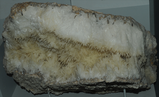 The Aragonite sample at left is about 4 x 14 cm. It is from Tintic district, Utah. Two generations of aragonite formed under different conditions. The coarse, needlelike crystals grew first, the crystal sprays later.