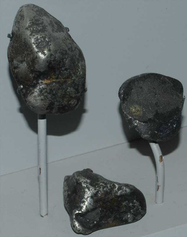 These samples of awaruite are displayed in the Smithsonian Museum of Natural History. Awaruite is a compound of nickel and iron with the composition Ni3Fe. The sample at left is about 3x3 cm and the one at right is about 3x1.5 cm. They are from Smith River, California.