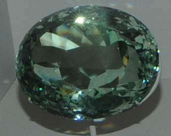 This green beryl gem is 577.9 caras and is from Teofilo Otoni, Minas Gerais, Brazil. It is about 10 cm across.