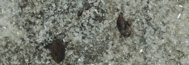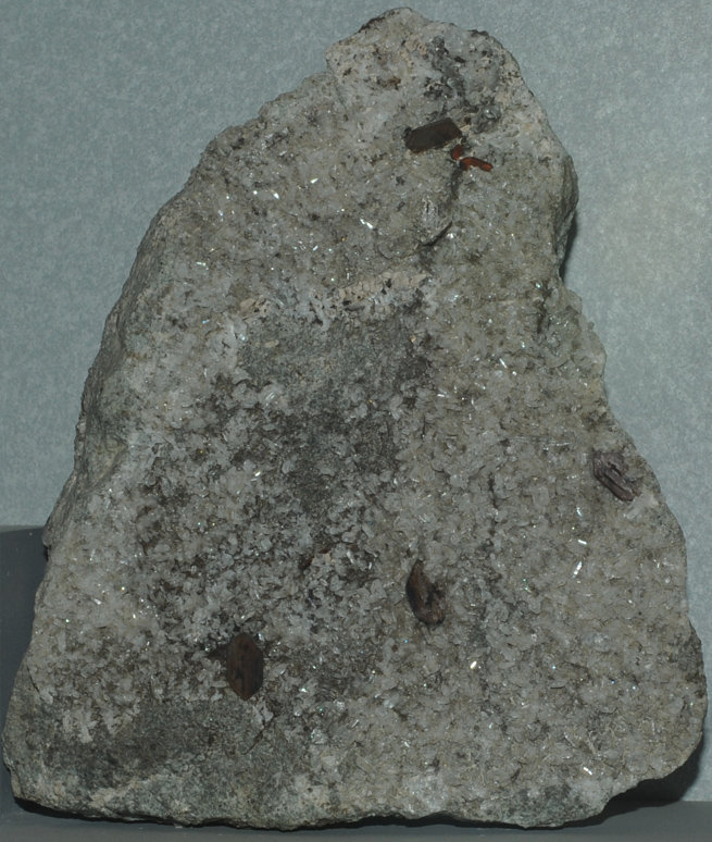 Brookite in wafer-like crystals is embedded in this larger rock sample along with small quartz crystals about the size of rice grains. The brookite crystals measure about a centimeter.