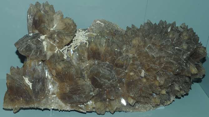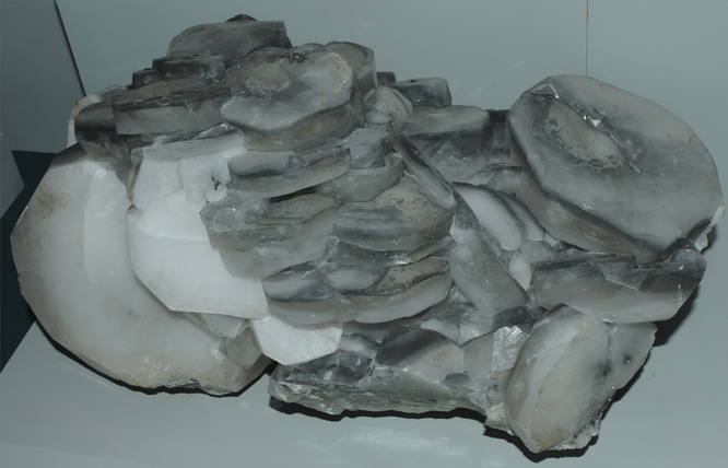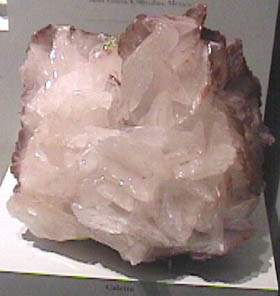 The calcite sample at right is from the Copper Queen mine in Bisbee, Arizona. The light blue color is presumably from a trace of copper, since it looks like the color of azurite. The sample size is about 12x25 cm.