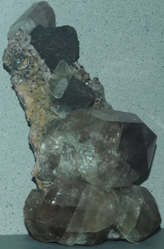 The three clear calcite crystals at left above, the tallest being about 25cm, are just the beginning of the vast variety of forms in which calcite appears. Since it is soluble in acidic water, it can be dissolved and recrystallized with a large number of different inclusions. All of the samples pictured here are on display at the Smithsonian Museum of Natural History.