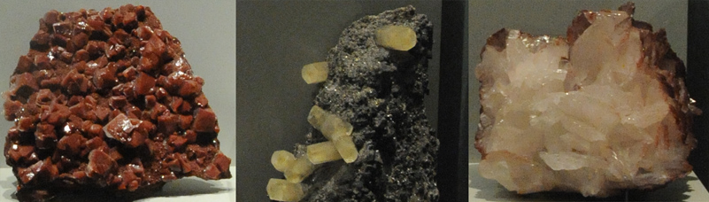 The red calcite at left above is calcite with goethite inclusions from Santa Eulalia, Chihuahua, Mexico. It is about 25cm wide. The center sample has calcite crystals growing from galena from Ozark lead mine, Ellington, Missouri. The complete sample is about 40cm high. The sample at right above is about 20cm wide and is from Namibia.