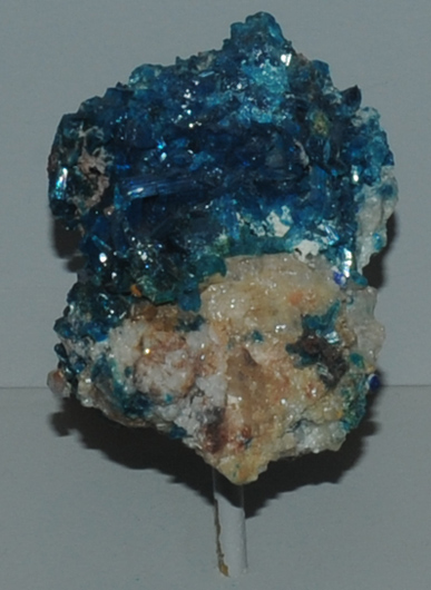 This sample of caledonite is displayed in the Smithsonian Museum of Natural History. Caledonite contains copper and lead with the composition Cu2Pb5(SO4)3(CO3)(OH)6. The sample at left is about 5 cm across and is from Mammoth mine, Tiger, Arizona. It is described as caledonite with anglesite.