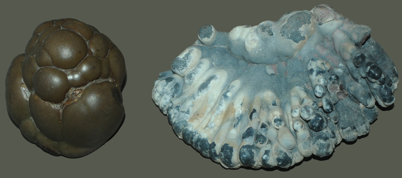 These samples of cassiterite have a very different appearance, as if they formed out of a melt. The sample on the left is from Arroya Carrizal, Guanajuato, Mexico and is about 12 cm across. The right sample is from Santin mine, Santa Catalina, Guanajuato, Mexico and is pictured at the same scale.