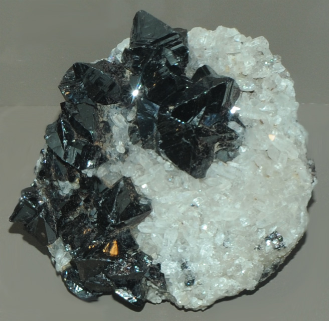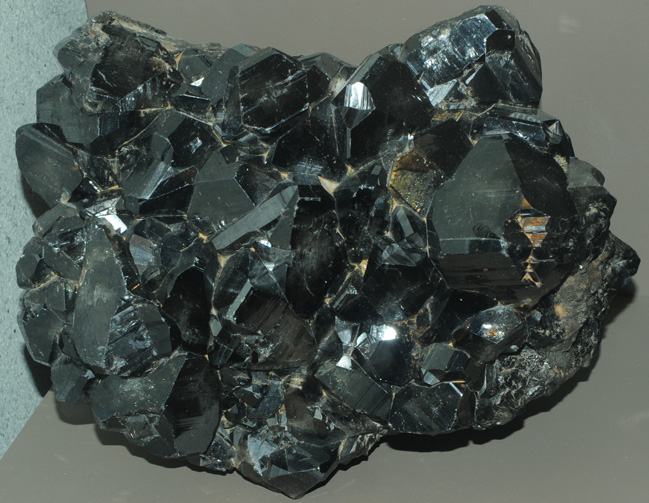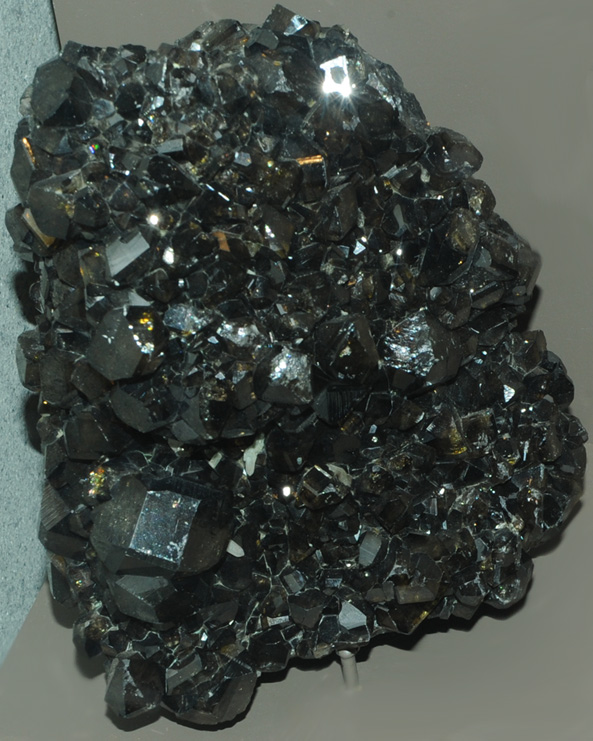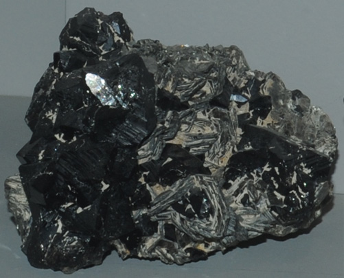 These samples of cassiterite are displayed in the Smithsonian Museum of Natural History. Cassiterite is an oxide mineral of tin with the composition SnO2. This sample is about 22 cm wide and it is from Bolivia.
