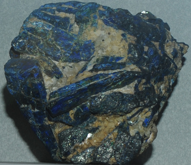 This sample of chalcostibite is displayed in the Smithsonian Museum of Natural History. Chalcostibite is a sulfide mineral of copper and antimony with the composition CuSbS2. This sample is about 7x7 cm and is from Rar El Ans, Cherrat, Morocco. The sample is described as chalcostibite altering to azurite with calcite.