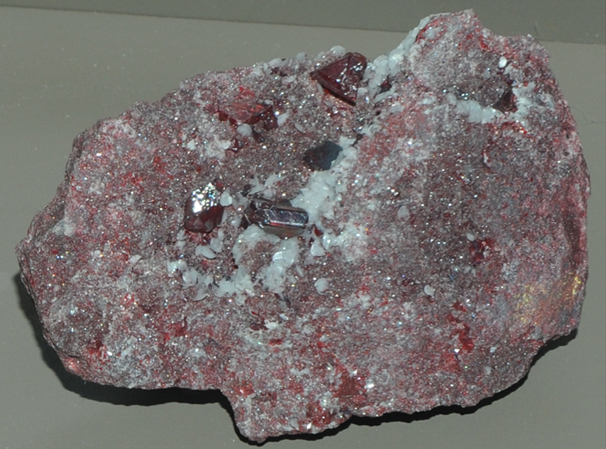 This sample is cinnabar with quartz and dolomite. The sample is about 10 cm wide and is from Hunan, China. It includes one large, twinned cinnabar crystal and several smaller ones, all dark red. Cinnabar is the major ore of mercury.