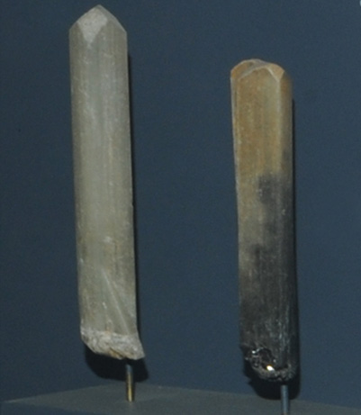 These danburite crystals are on the order of 1x12 cm and are from Toroku mine, Miyazaki, Japan.