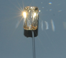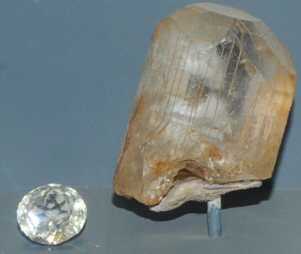 These samples of danburite, CaB2Si2O8, are on display in the Smithsonian Museum of Natural History. The danburite crystal shown is on the order of 4 cm diameter. The gem is 18.5 carats. The origin of this sample is Burma.