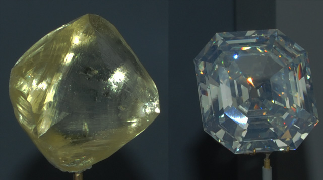 The diamond immediately right is the Oppenheimer Diamond from Dutoitspan mine, Kimberley, South Africa. It is remarkable not only for its size, 253.7 carats, but also because it has survived uncut. Its double pyramid or octahedral shap is typical of many diamond crystals.
