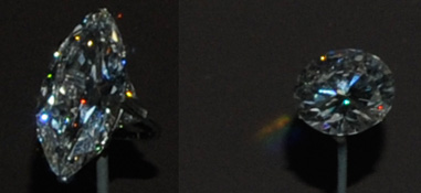 At left is a 28.3 carat marquise-cut diamond ring. At right is the 16.72 carat Pearson Diamond from South Africa. The round, brilliant cut enhances the superior qualities of this nearly colorless, flawless diamond.