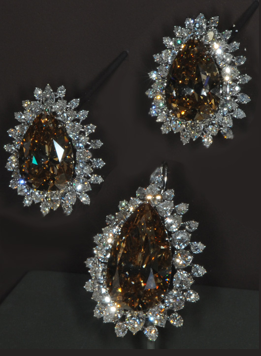 Thompson DiamondsThe brooch is 36.73 carats and the earclips are 39.58 carats. The three cognac-colored, pear-shaped diamonds wer cut in 1956 from a single 264-carat crystal. Nearly 20 carats of pear-shaped white diamonds accentuate the matching set.