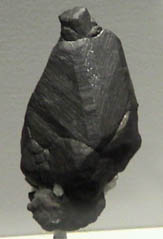 This sample of digenite is displayed in the Smithsonian Museum of Natural History. Digenite is a sulfide mineral of copper with the composition Cu9S5. This sample is about 1.5x4 cm and is from Leonard mine, Butte, Montana.