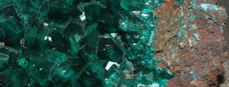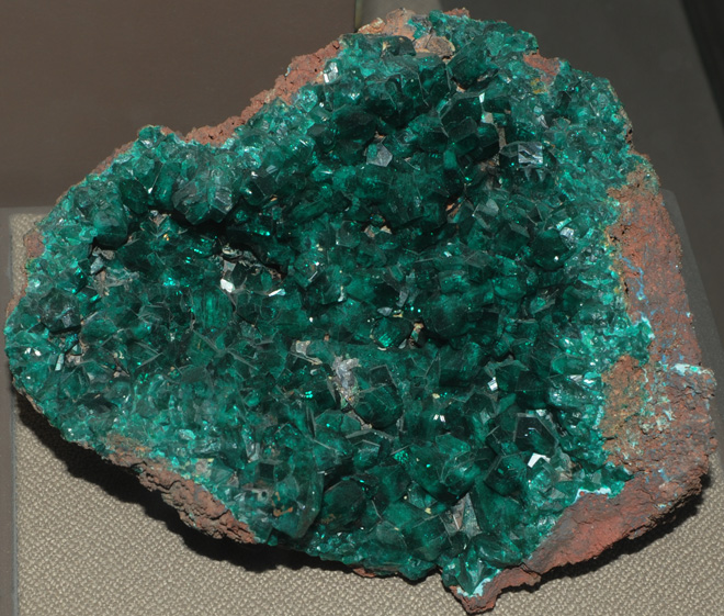 This sample of dioptase is on display at the Smithsonian Museum of Natural History. Dioptase is a silicate mineral of copper with the composition CuSiO3.H3O. The sample at left is about 16x14 cm and is from Reneville, Congo.