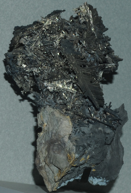 This sample of dyscrasite is displayed in the Smithsonian Museum of Natural History. Dyscrasite is a compound of silver and antimony with the composition Ag3Sb . This sample is about 8x16 cm and is from Pribram, Cechy, Czech Republic . This sample also contains stibarsen.