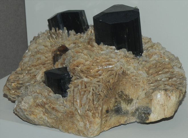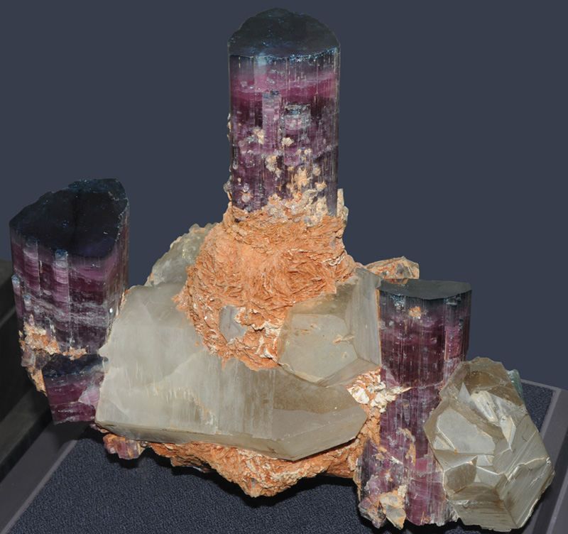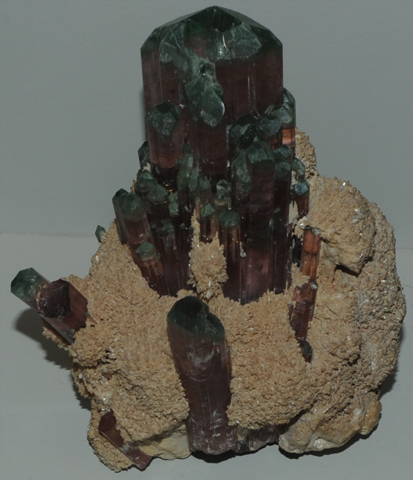 This magnificent sample of elbaite with albite and quartz is from the Tourmaline Queen mine, San Diego County, California. It is about 25 cm wide. As the elbaite crystals grew, the growth solution changed from manganese-rich to iron-rich, creating a blue top on each "candle" (This sample is nicknamed "Candelabra").