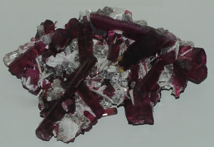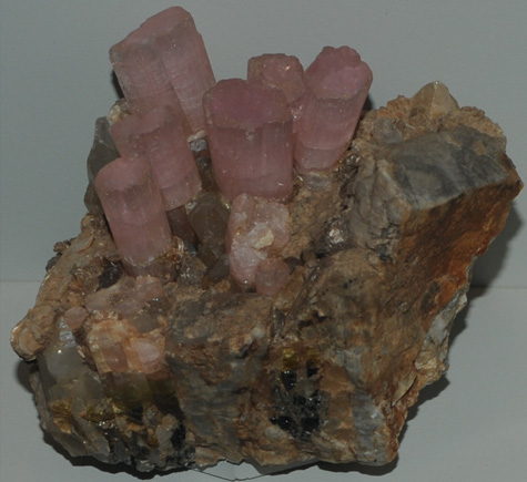 The sample above is elbaite with quartz and albite. It is about 10 cm across and is from Stak Nala, Gilgit, Northern Areas, Pakistan.