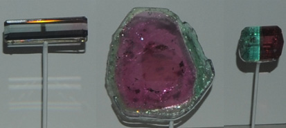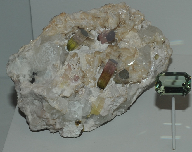 The elbaite gem above left is 48 carats and is from Tourmaline queen mine, Pala, California. The two elbaite samples above right are 151.2 and 44.2 carats and are from Nevel gem pit, Newry, Maine.