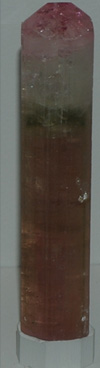 This elbaite sample is from Santa Rosa mine, Minas Gerais, Brazil and is about 8-10 cm at its base. It shows the kind of progession in color that can occur with crystal growth in elbaite.