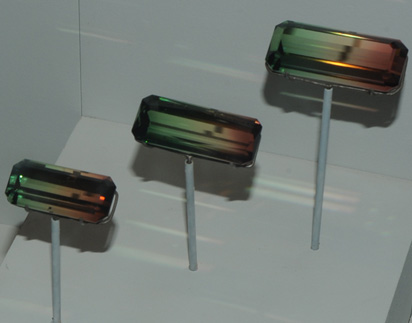 This set of elbaite gems is titled "Bicolor Tourmaline Trio" with gems of 60.73, 75.24 and 90.03 carats. They are from Mozambique.