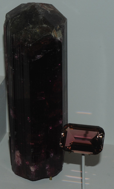 | The branched column at left is from Jonas mine, Itatiaia, Minas Gerais, Brazil. It is elbaite of the variety rubellite. The center speciment is a short column of about 10 cm diameter and at right is a 15.9 carat gem from Madagascar. They are all at the same scale.