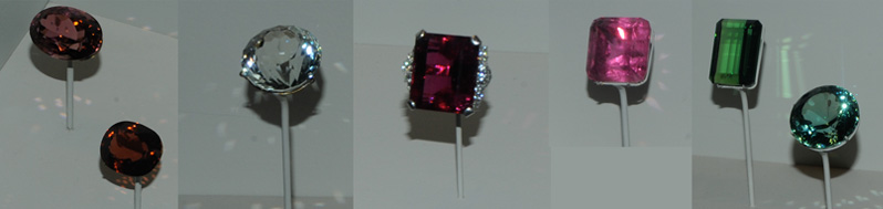 At left above are two elbaite gems of the variety rubellite. They are 62.4 and 40.2 carats and are from Minas Gerais, Brazil. Next is elbaite of variety achroite. The gem is 31.9 carats and is from Nuristan, Afghanistan. Next is another elbaite gem of variety rubellite. It is set with diamond. It is 50.5 carats and is from Minas Gerais, Brazil. Next is another rubellite gem of lighter color at 100.4 carats from Stewart mine, Pala, California. At far right the green elbaite gems are 109.6 and 117.6 carats from Minas Gerais, Brazil.