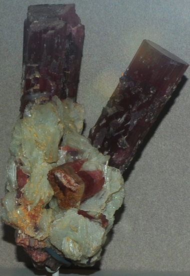 The twin column at left is elbaite of variety rubellite and is formed with albite. It stands about 20 cm high and is from Himalaya mine, Mesa Grande, California.