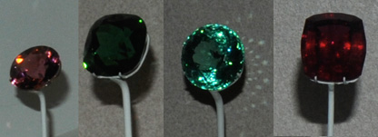The two gems at left above are of the variety rubellite and are 18.4 and 58.5 carats. They are from Mt. Mica, Paris, Maine. The green gem is 48.7 carats and is from Nevel gem pit, Newry, Maine. The right gem is elbaite of the rubellite variety. It is 37.8 carats and is from Tourmaline Queen mine, Pala, California.